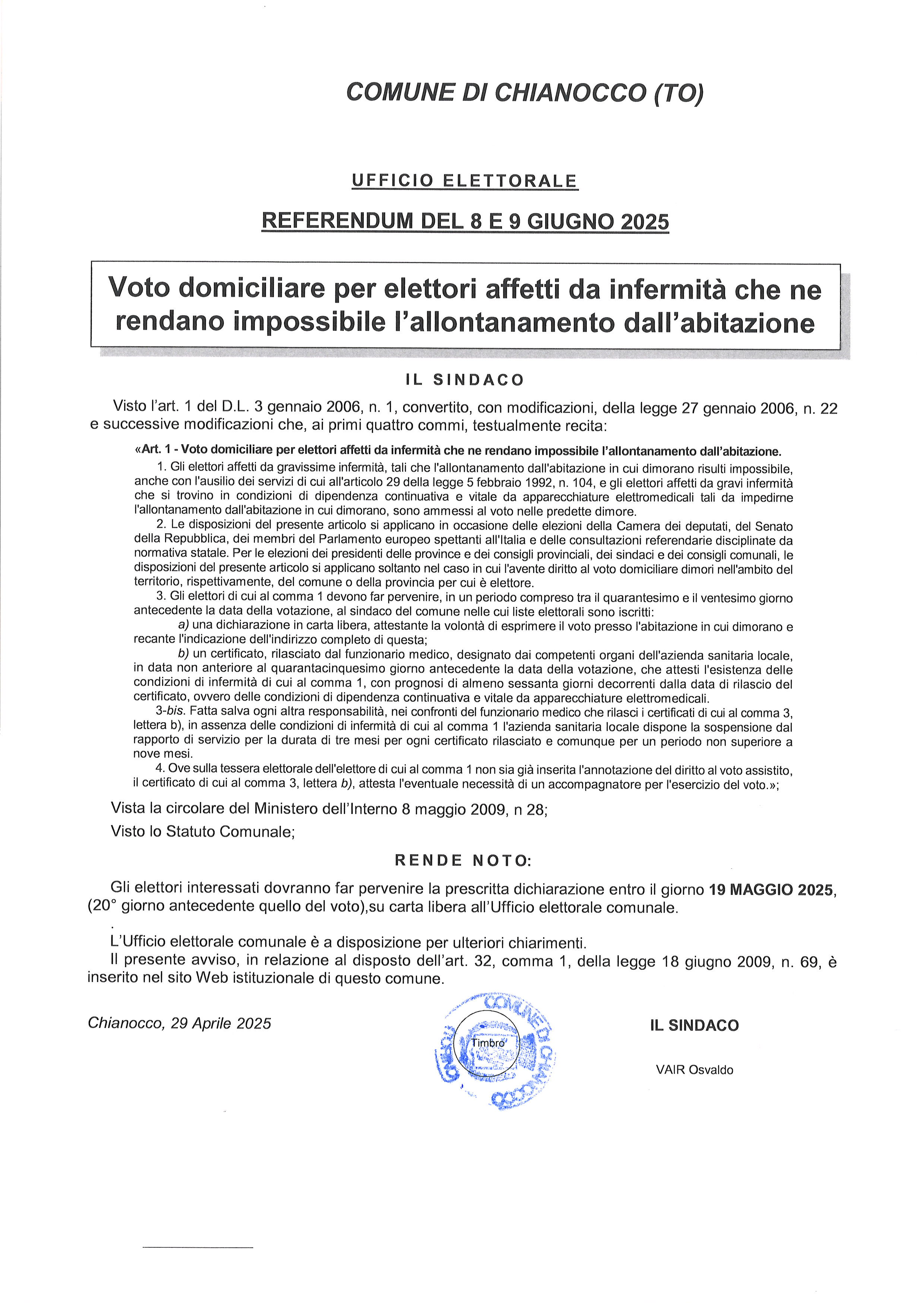 Descrizione Referendum dell'8 e 9 Giugno 2025 - Voto domiciliare per elettori affetti da infermità che ne rendano impossibile l'allontanamento dall'abitazione