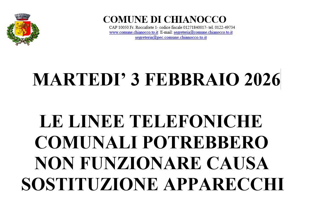 Descrizione MARTEDI’ 3 FEBBRAIO 2026LE LINEE TELEFONICHE COMUNALIPOTREBBERO NON FUNZIONARE CAUSASOSTITUZIONE APPARECCHIPER URGENZE CHIAMARE IL 335/6486573
