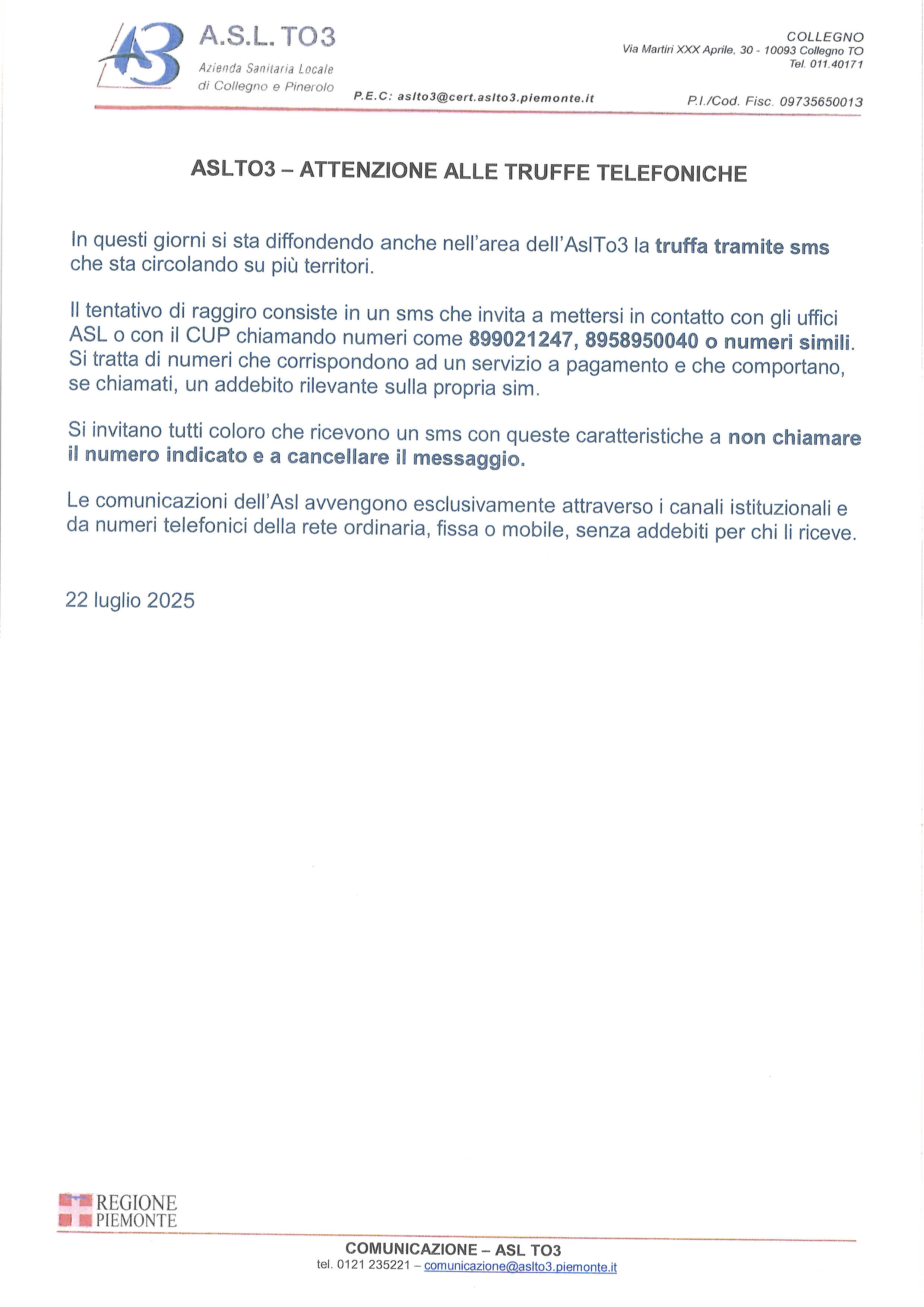 ASLTO3 - ATTENZIONE ALLE TRUFFE TELEFONICHE