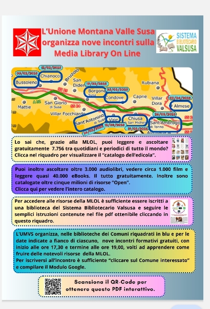 L'Unione Montana Valle Susa organizza, nelle biblioteche dei Comuni riquadrati in blu e per le date indicate a fianco di ciascuno, nove incontri formativi gratuiti, con inizio alle ore 17,30 e termine alle ore 19,00 volti ad apprendere come fruire delle notevoli risorse della Media Library On Line.