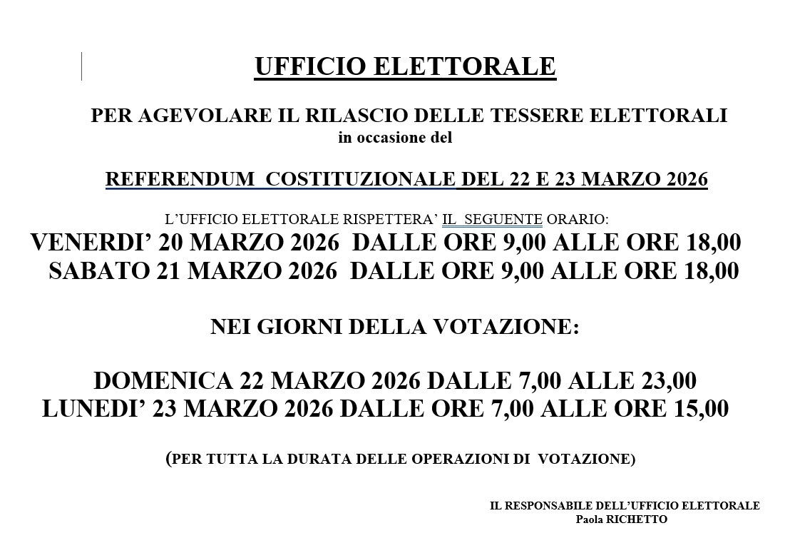 L’UFFICIO ELETTORALE RISPETTERA’ IL SEGUENTE ORARIO: